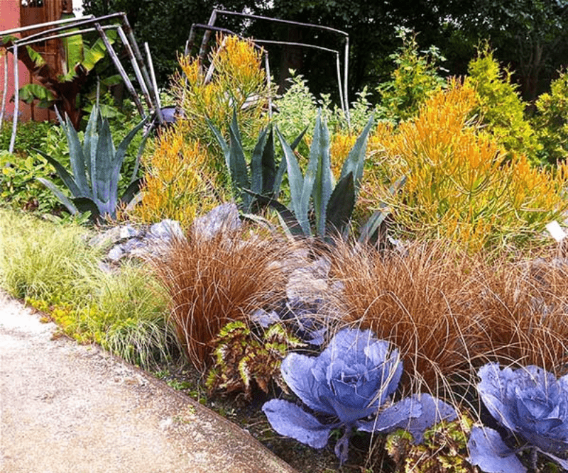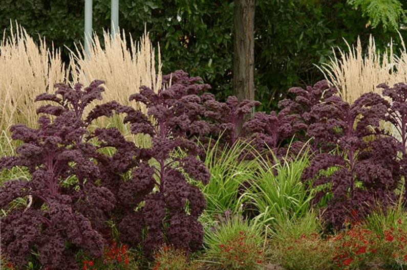 Ozdobna rabata kwiatowa, w której wprowadzono jarmuż „Redbor” (Brassica oleracea var. acephala ‘Redbor’) o purpurowych jadalnych liściach