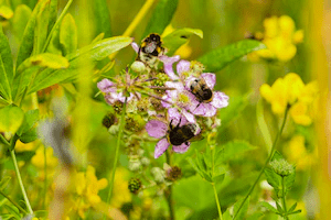 Trzmiele płowe, pochodzące z Europy, żywią się kwiatami jeżyny w Puerto Blest w Argentynie. Zdjęcie Eduardo E. Zattara