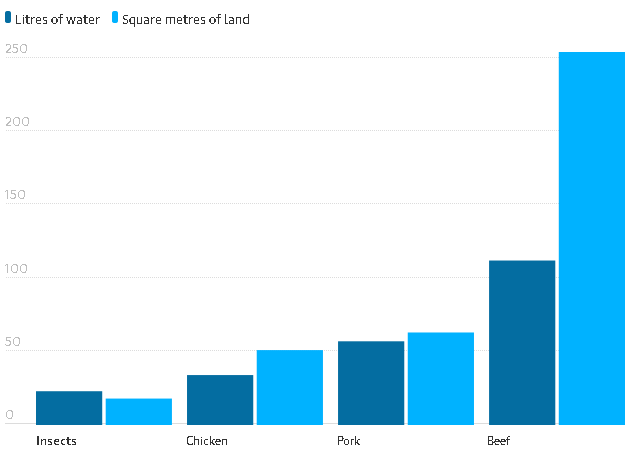 W przeciwieństwie do krów czy świń, owady można rozmnażać w znacznych ilościach bez zajmowania dużej ilości ziemi, wody lub paszy.